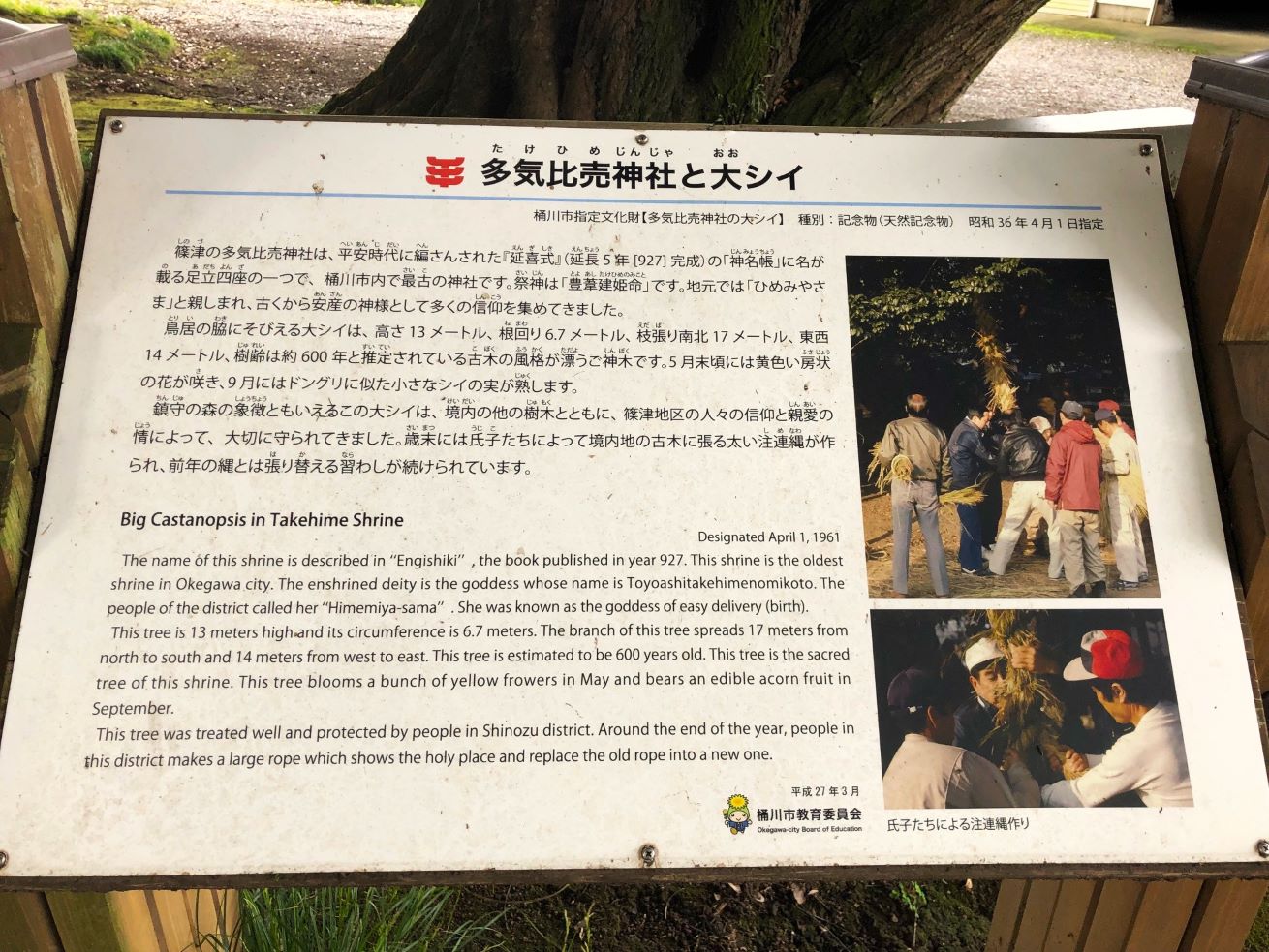 手水舎の右手には「多気比売神社と大シイ」の案内板も設置されている。