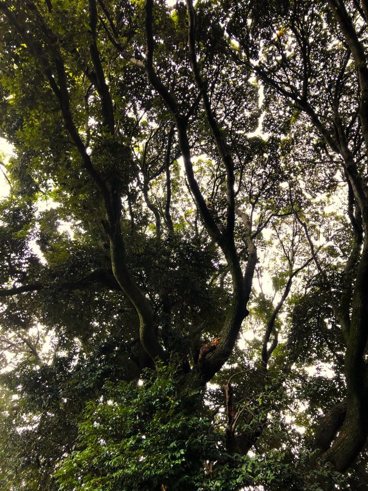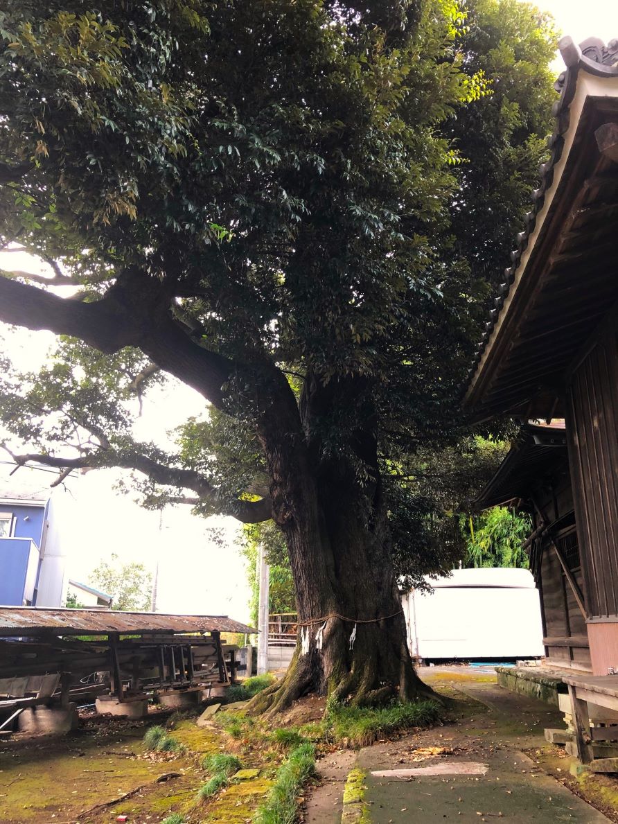 鳥居の右側に聳え立つ大シイの大木がひときわ目立つ。樹齢は600年という。