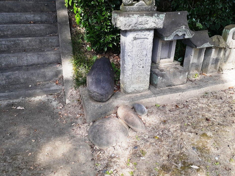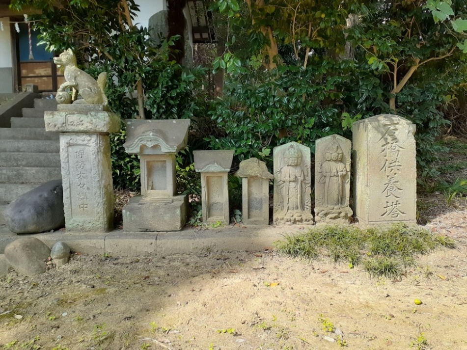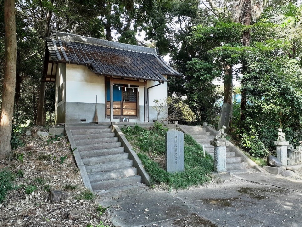 拝殿手前の石段右側にある石碑と燈篭 拝殿左側に祀られている境内社