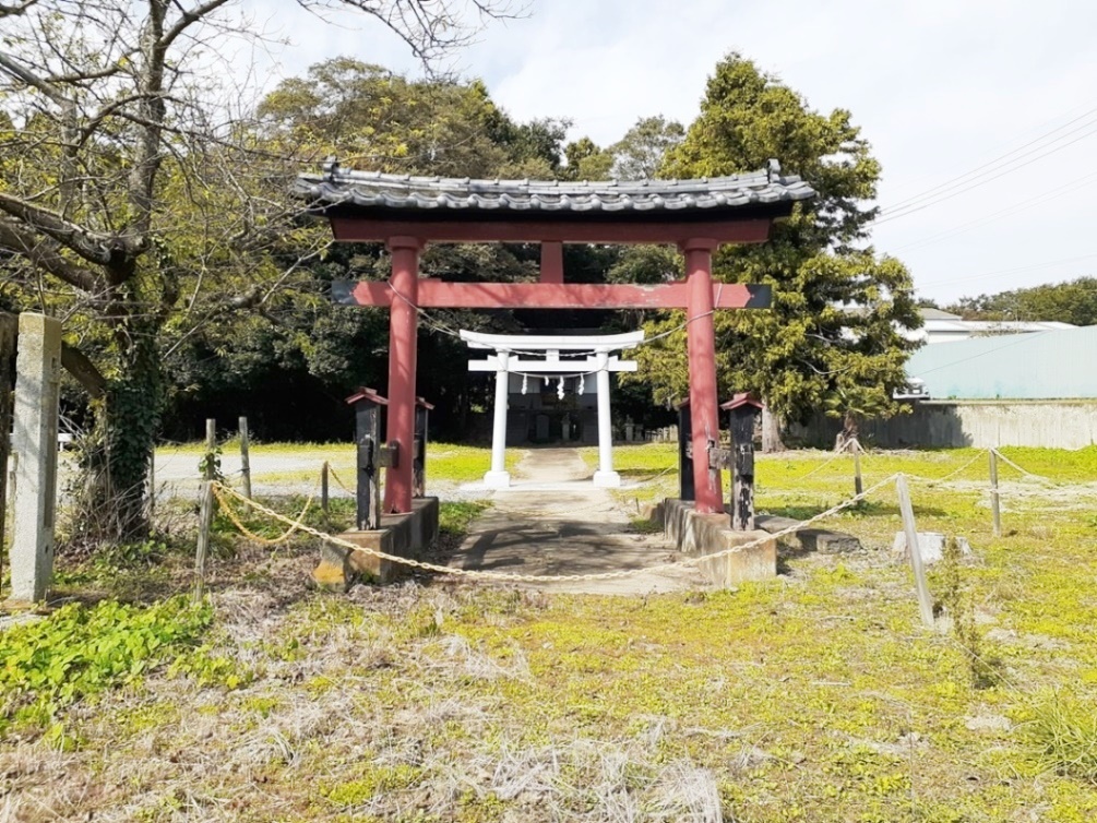 木製で白を基調とした鳥居 南北に広がる参道