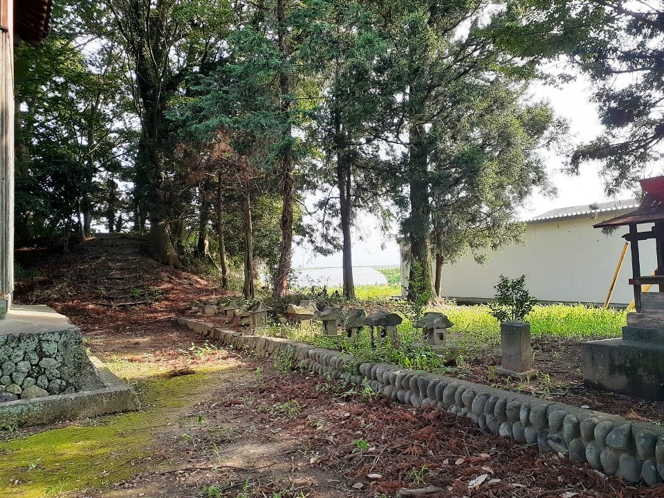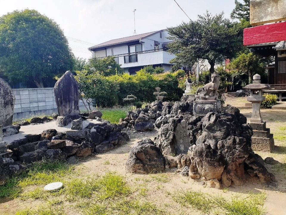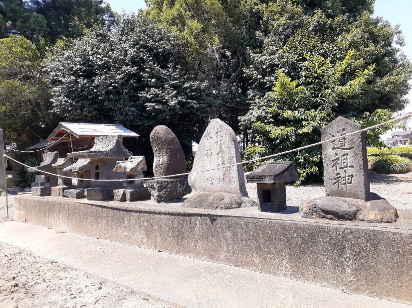 街中にありながら境内は比較的広い。 境内参道の右側には「猿田彦大神」等の石碑がある。