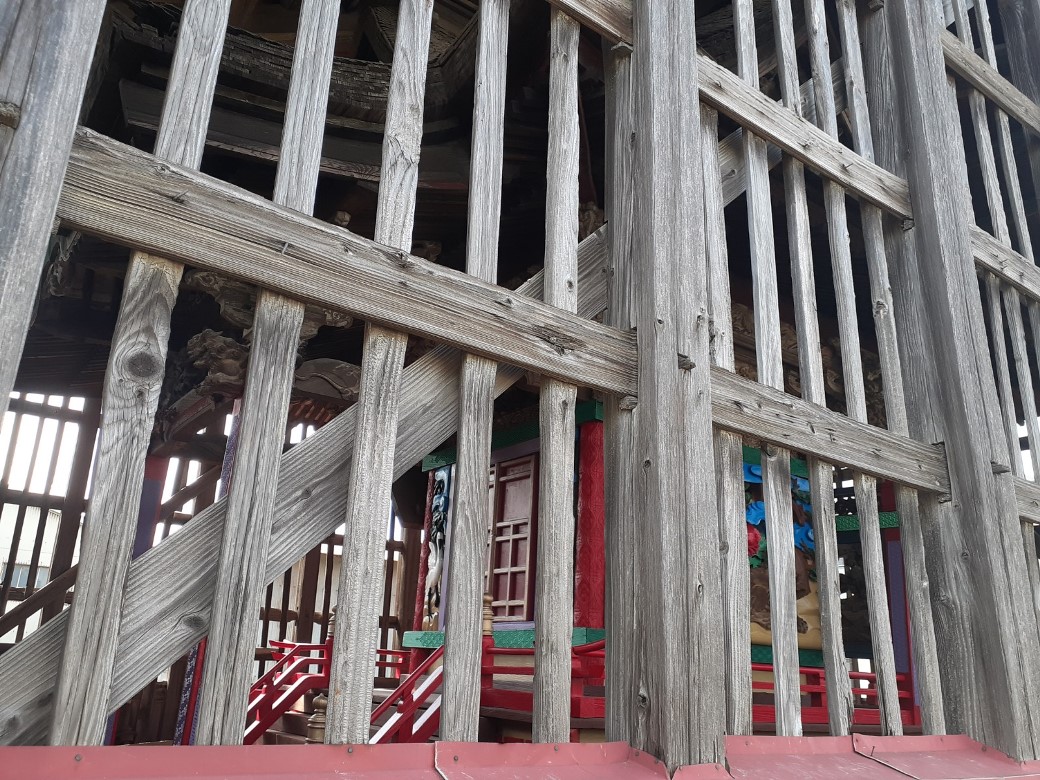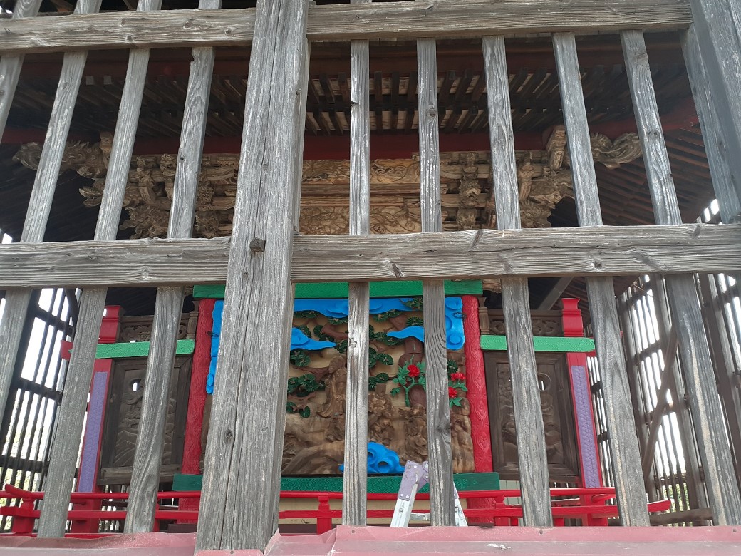 絢爛豪華な本殿彫刻(写真左・右)。どうやら彩色修復の作業が行われているようだ。