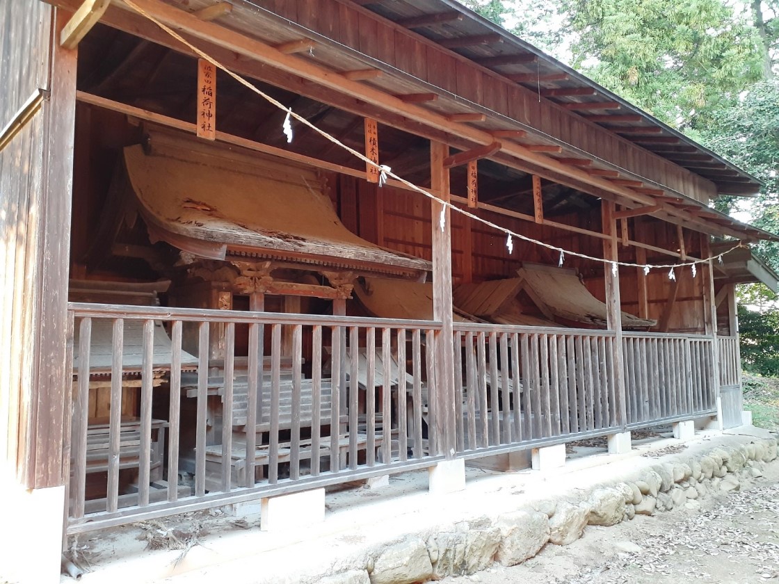 拝殿右側に並んで鎮座する境内社(同右)。左側から「日枝神社」、「合祀 稲荷神社・石船神社・天手長男神社」、「津島神社」。